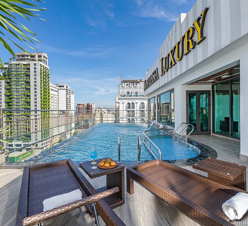 + Hồ bơi vô cực nằm trên tầng cao nhất của khách sạn, tầng 15, giúp bạn có thể tận hưởng bao quát không gian từ trên tầng cao nhất nhìn xuống biển, một dãi biển xanh mát tuyệt đẹp – Biển Mỹ Khê và toàn thành phố về đêm tuyệt đẹp