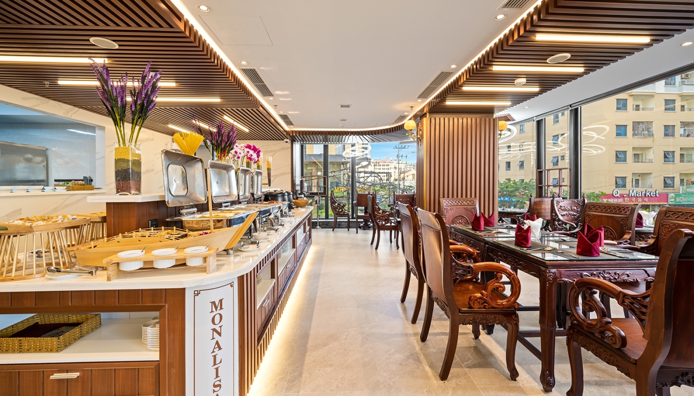 Nhà hàng Á Âu tại tầng thượng khách sạn là một không gian ẩm thực đặc biệt, kết hợp giữa hai nền văn hóa ẩm thực, là một điểm đến lý tưởng cho những người muốn khám phá và trải nghiệm sự đa dạng của các món ăn từ hai lục địa khác nhau trong một môi trường sang trọng và đẳng cấp.