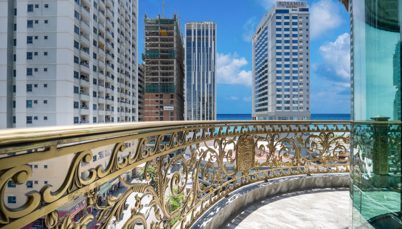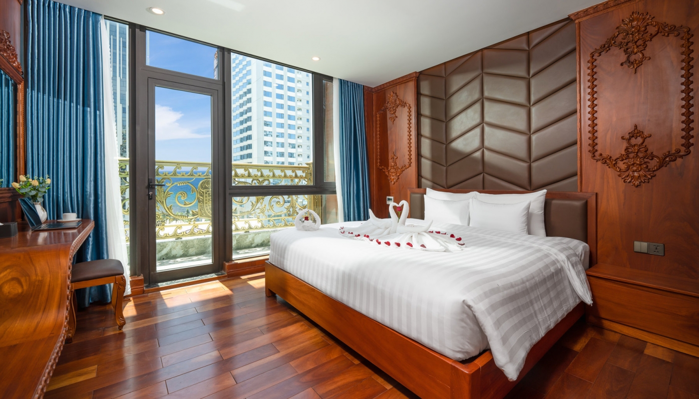 Phòng có tầm nhìn hướng Biển, tầng cao, có cửa sổ, có bồn tắm, có phòng khách, có Ban công lớn bao quanh phòng